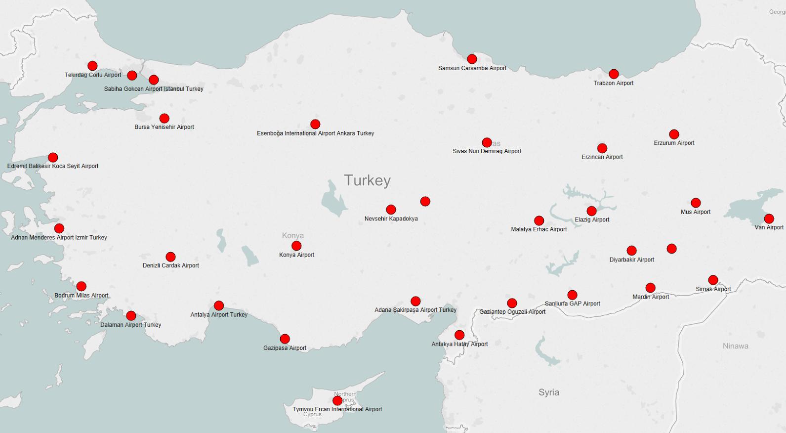 مطار أنطاليا هو مطار دولي على بعد 13 كم شمال شرق وسط المدينة. وهو مطار مهم للغاية، وخاصة خلال موسم الصيف لموقعه على ساحل البحر الأبيض المتوسط. ومن البلد الثالث وأوروبا المطار الخامس عشر ازدحاما. لديها اثنين من محطة دولية، ويرجع ذلك إلى حقيقة أن 70٪ من الركاب هم من الأجانب، وصالة واحدة محلية. مطار أنقرة إيسنبوغا هو مطار دولي يخدم عاصمة تركيا، أنقرة. وهو رابع أكثر المطارات ازدحاماً في البلاد من حيث حركة المسافرين. وهو يقع على بعد 28 كم من وسط أنقرة كما ترون في خريطة مطار تركيا. نظراً لمدى قربه من المدينة، فإن المطار متصل بشكل جيد به بواسطة Havaş Shuttle أو عن طريق خط الحافلات بين المدن 442. تهبط حوالي 280 طائرة وتقلع يوميا من مطار أنقرة إيسنبوغا من قبل أكثر من 20 شركة طيران.